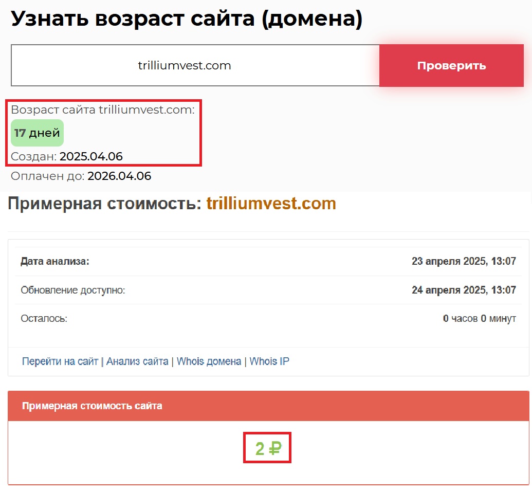 И вот еще что нас особенно зацепило. Возраст домена — всего-то17 дней. То есть, 6 апреля 2025 года — день, когда вся эта афера начала свое существование. А вы помните, что они обещают? «Многолетний опыт». Ха, какой опыт? Они даже месяц не продержались. Это уже не просто настораживает. Стоимость сайта, по нашим данным, составляет… два рубля. Скажите честно, вы бы доверили свои деньги платформе, которая сама стоит дешевле буханки хлеба? Мы тоже — нет. И абсолютно уверены, что вы — разумный человек, который задает себе те же вопросы.