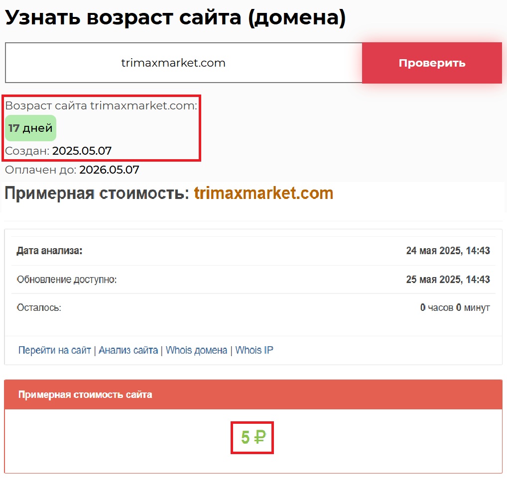 И вот здесь начинается самое интересное. Мы заглянули в базу Whois, чтобы проверить возраст домена. И знаете что? Оказалось, что сайт появился совсем недавно — 7 мая 2025 года. 17 дней назад, если быть точными. Какой уж тут «многолетний опыт»? Это просто уловка, чтобы создать иллюзию стабильности. Вам внушают: мол, все работает давно и слаженно. А по факту — проект и года не прожил.