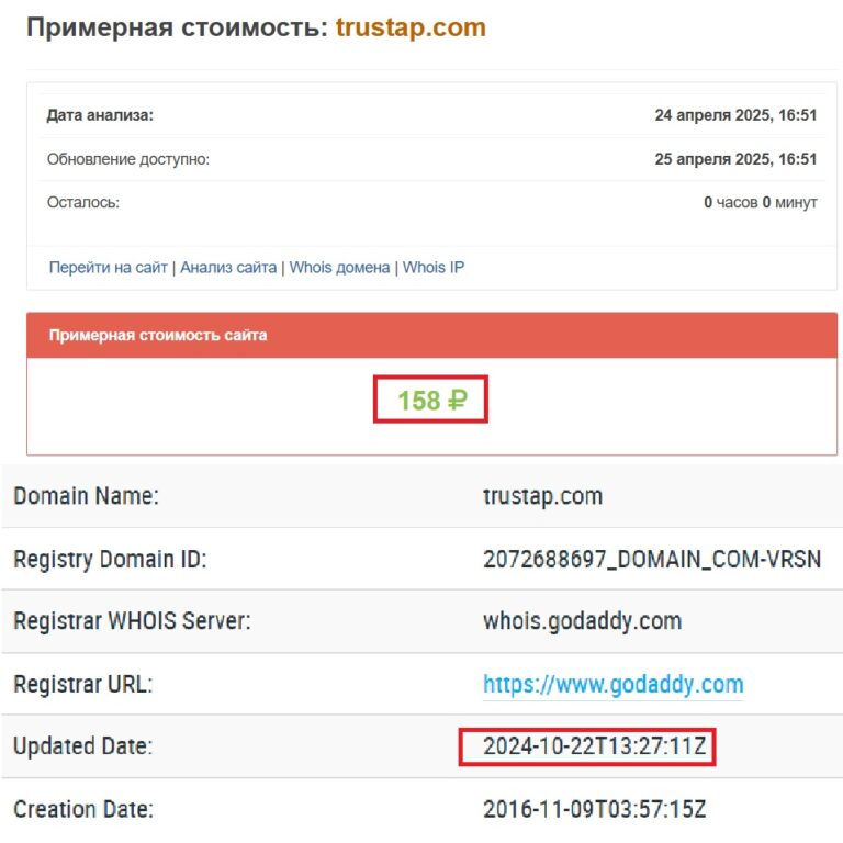 Проведя анализ Trustap, мы обнаружили немалый список моментов, подтверждающих тот факт, что за фирмой стоят обыкновенные злоумышленники. Начнем обзор с изучения сведений о сайте. С помощью специализированных сервисов нам удалось выяснить, что домен лжекомпании был зарегистрирован в далеком 2016 году. Однако 22 октября 2024 года он получил обновление и лишь с этого времени на нем началась активная работа.