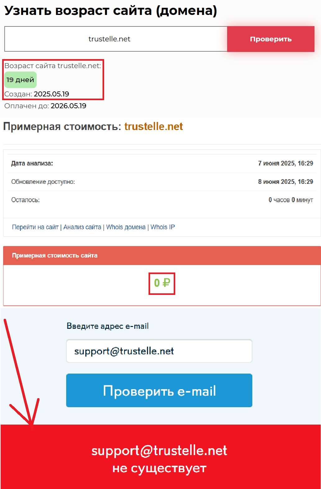 О лицензии говорить даже не приходится. Никто и не пытается скрывать, что никакого регулятора за проектом не стоит. Потому что невозможно пройти регуляторную проверку, не соответствуя вообще никаким критериям. А как вам такая деталь: возраст проекта — всего 10 дней. То есть стартовал он, по данным Whois, 19 мая 2025 года. А это очень, очень мало. Серьезные организации годами зарабатывают репутацию. Ну и напоследок — любимое. Стоимость домена в ноль рублей.