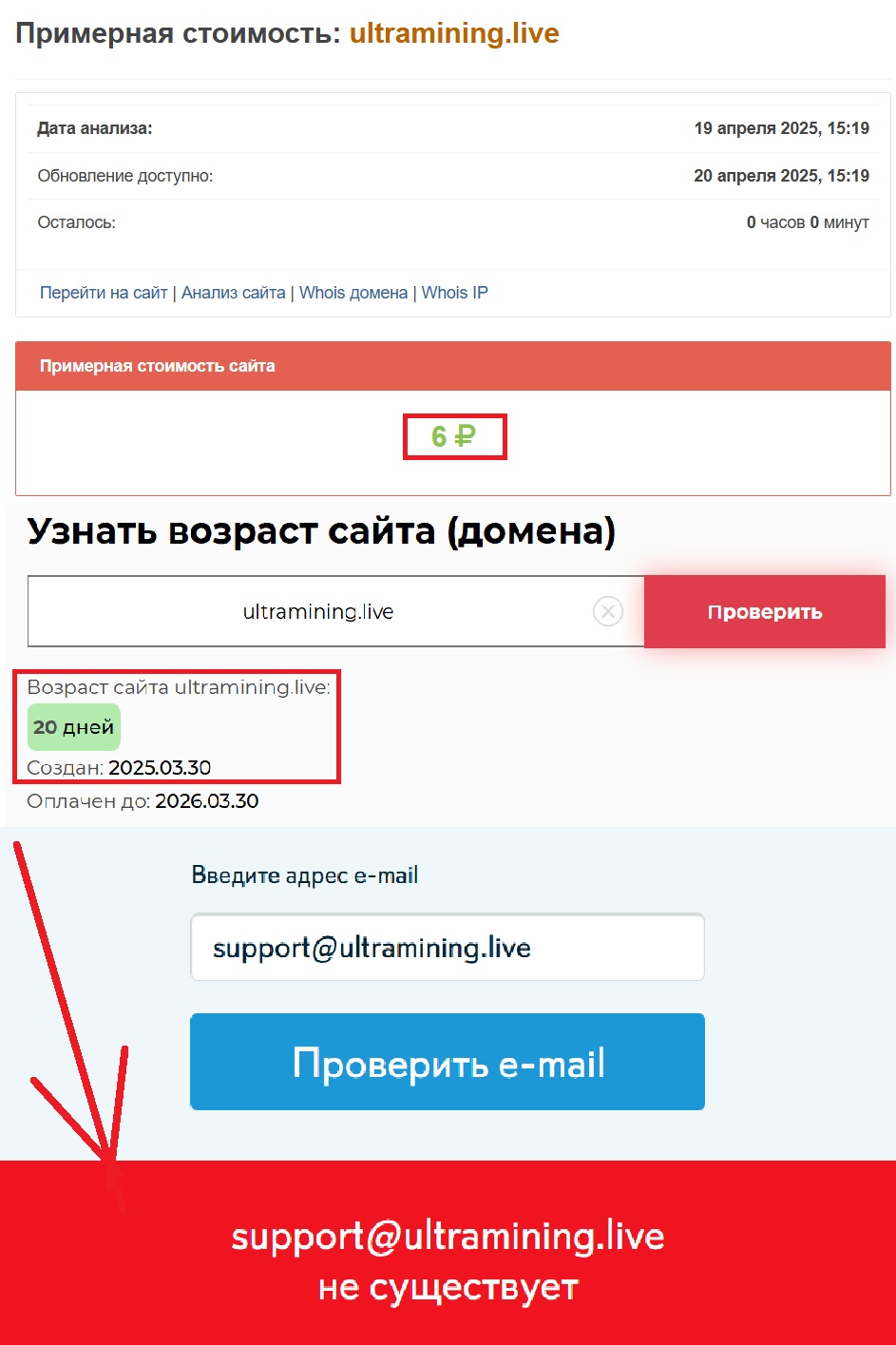 Теперь — про контакты. И тут, как ни странно, все тоже довольно прозрачно. Указанная электронная почта support@ultramining.live поддельная. Возникает ощущение, что никакой службы поддержки в принципе не существует. То есть, даже если вы захотите задать какой-либо вопрос или попытаться вернуть свои деньги — связаться с представителями платформы будет попросту невозможно.