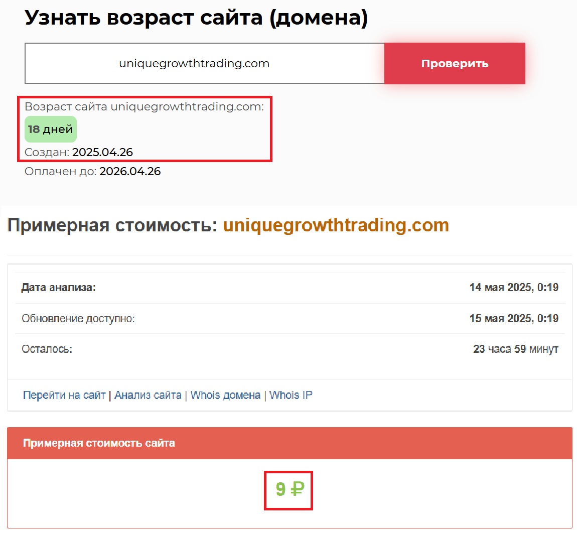 Нам часто задают вопрос: как можно проверить, насколько серьезна та или иная платформа? Один из самых простых способов — заглянуть в историю домена. Как оказалось, герой данного обзора появился 18 дней назад, то есть 26 апреля 2025 года. По сути, речь идет о проекте, которому чуть меньше месяца от роду. Стоимость этого примитивного проекта составляет девять рублей, что ничтожно мало для нормальной компании.