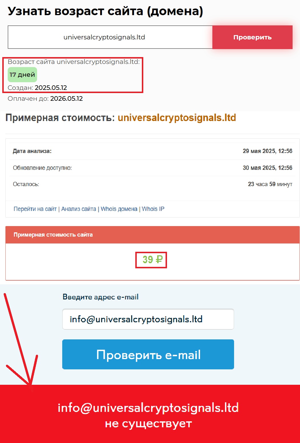 Интересный факт — в описании говорится о многолетнем опыте компании. Но проверка через Whois и Seolik показывает, что домен зарегистрирован совсем недавно, если быть точнее 17 дней назад. По сути афера начала свою деятельность 12 мая 2025 года. А стоимость самого сайта составляет около 39 рублей. Как-то несерьезно для “международного брокера”, не находите? Ни лицензии, ни регистрации от какого-либо регулятора, всюду сплошная тишина и это не может не насторожить.