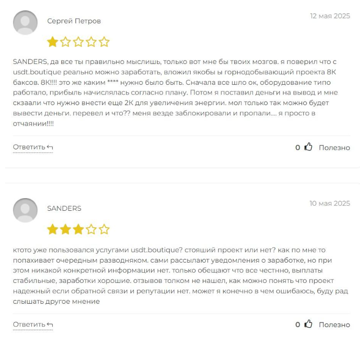 Отзывы о USDT Boutique в Интернете преимущественно негативные. Люди жалуются на невозможность вывода средств, собственные финансовые потери, отсутствие прозрачности.