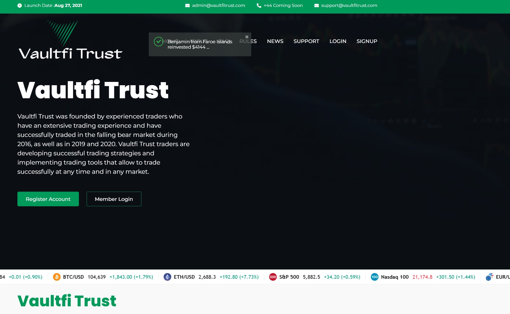 С самого начала vaultfitrust.com старается произвести впечатление серьезного игрока. Громкие заявления, графики, термины — создается впечатление, что вы попали в мир больших денег. Но стоит остановиться, сделать паузу и приглядеться внимательнее — вся эта пыль рассыпается буквально в руках. Сайт, по сути — слепок с десятков других мошеннических ресурсов. Одни и те же шаблоны, те же пустые блоки, знакомый до боли язык. И если вы раньше сталкивались с финансовыми аферами — вы это сразу почувствуете.