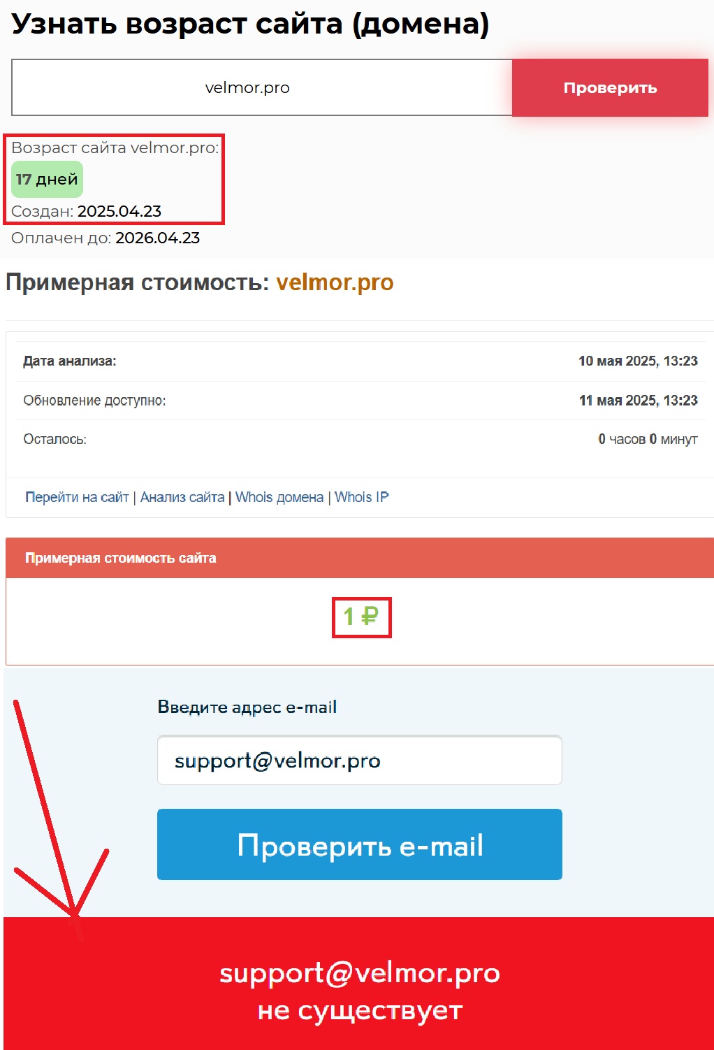 Интересно, что сайт, на котором все это базируется, по оценке аналитических сервисов не стоит ни копейки. Буквально — один рубль. Ни о какой серьезной инфраструктуре здесь речи не идет. Это просто иллюзия. Причем не самая дорогая. Мы, признаться, сомневаемся, что уважающий себя брокер стал бы запускать продукт на платформе, за которую не заплачено даже минимального взноса. Контактные данные представлены в виде почты support@velmor.pro и адреса в Вене, жаль только что оба этих пункта фальшивые.