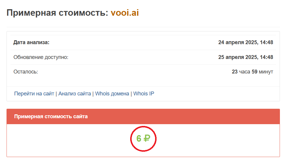 Обратите внимание на дату создания домена — 30 октября 2024 года (площадке почти пол года). Примерная стоимость сайта составляет всего 6 рублей, что уже можно назвать тревожным знаком. Автора пространства утверждают, что их одностраничный ресурс ежедневно обрабатывает более 100 000 транзакций и что у них около 120 000 клиентов. Но эти данные не подтверждаются документально.