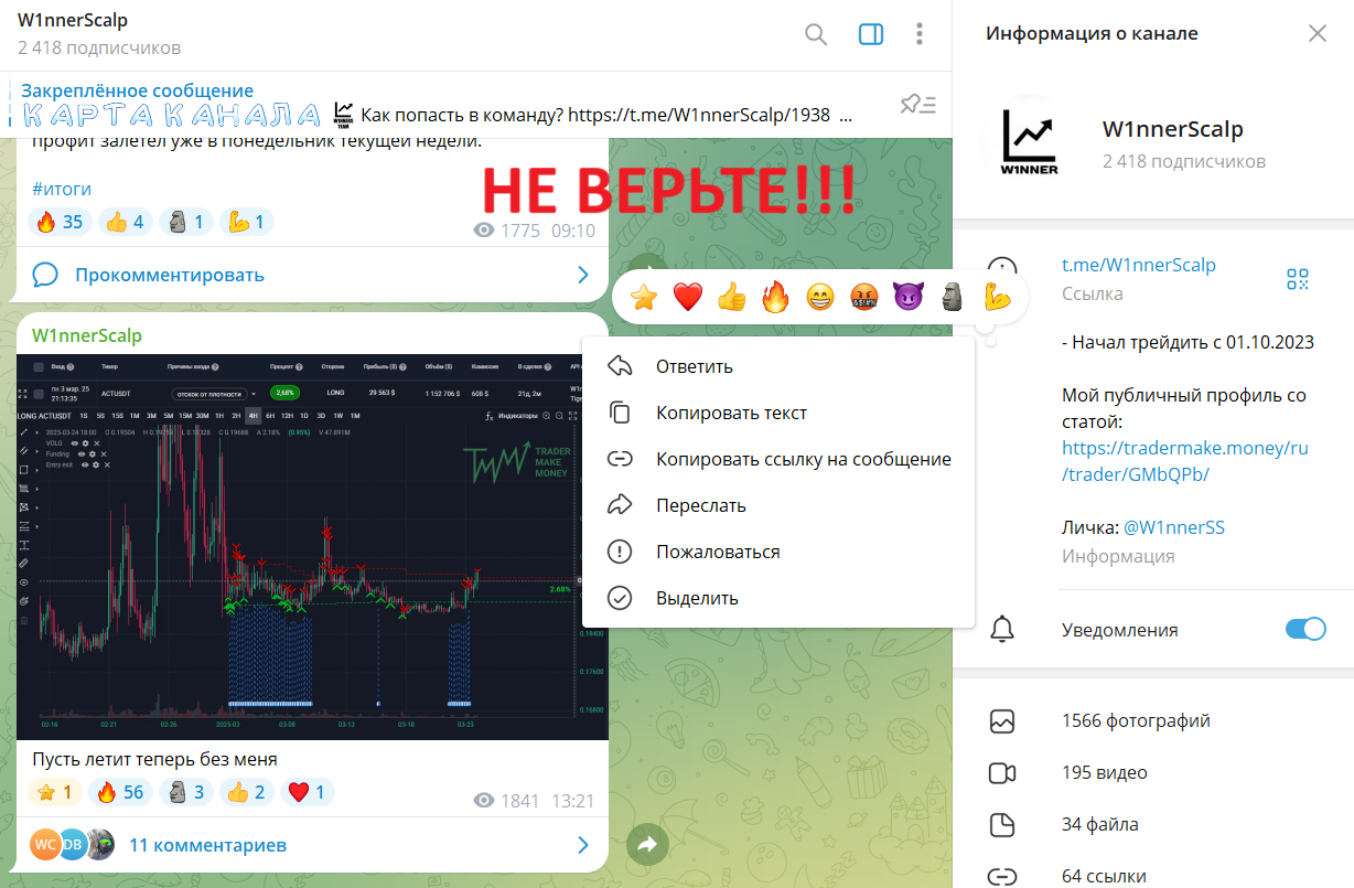 С осени 2024 в пространстве стали активно выходить посты об успехах админа в торговле. Со временем он и вовсе объявил набор на платное обучение. Однако уже в феврале 2025 жулик написал, что больше никакого обучать не будет. Вместо этого Антон предпочел набирать команду людей, которые умеют стабильно зарабатывать (не хуже него), и даже выписал несколько требований к участникам.