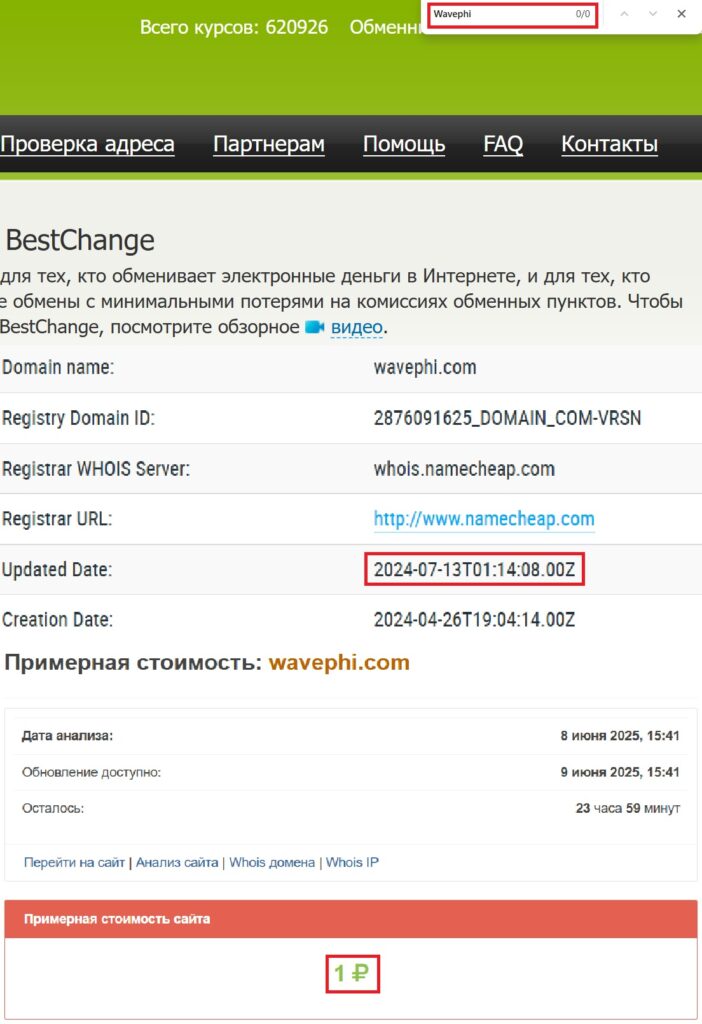 Изучая данные о Wavephi, можно заметить несколько подозрительных моментов. Вот, к примеру, как тот, что сайт обменника работает всего несколько месяцев, но его автора при этом рассказывают о нескольких годах функционирования. Они всего лишь пытаются впечатлить невнимательных пользователей своим “большим опытом”, указывая совсем неверный возраст платформы. Проверить реальный период функционирования ресурса можно на специализированных сервисах.