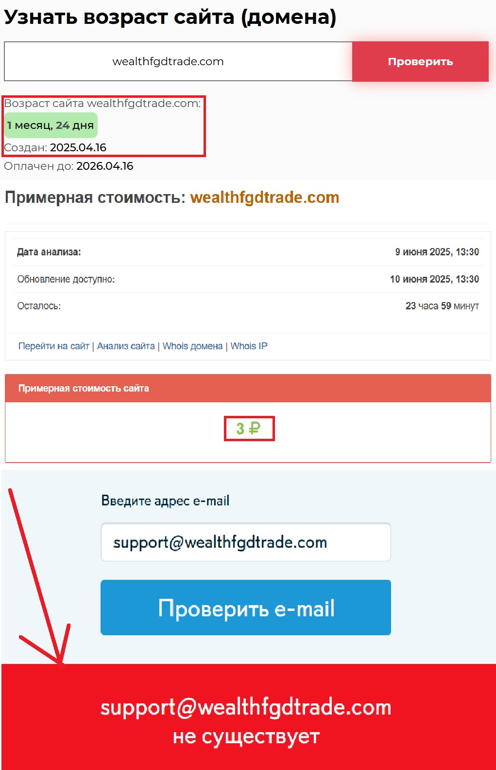 И вот еще что важно. Стоимость сайта, если верить тому же Seolik — три рубля. Не тысяча, не сто рублей. Три. Делайте выводы сами: серьезная организация не будет запускать серьезный финансовый сервис на пустом месте и за бесплатно. Контактные данные, которые они указали на сайте, выглядят прилично — адрес 3015 W Moore St, Suite 102, Richmond, VA 23230, электронная почта support@wealthfgdtrade.com. Все как надо. Но вот беда — эта информация фейковая.