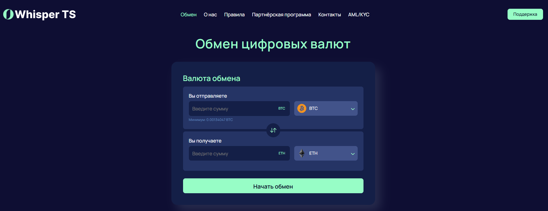 Ежедневно на просторах сети появляются площадки, внешне выглядящие солидно. Однако немало таких контор оказываются обычными пустышками. Среди подобных проектов можно выделить Whisper T-Swap, который его создатели представляют аудитории как надежный и удобный обменник крипты. Работать с данным сервисом определенно нельзя, так как в итоге можно с легкостью лишится крупных сумм.