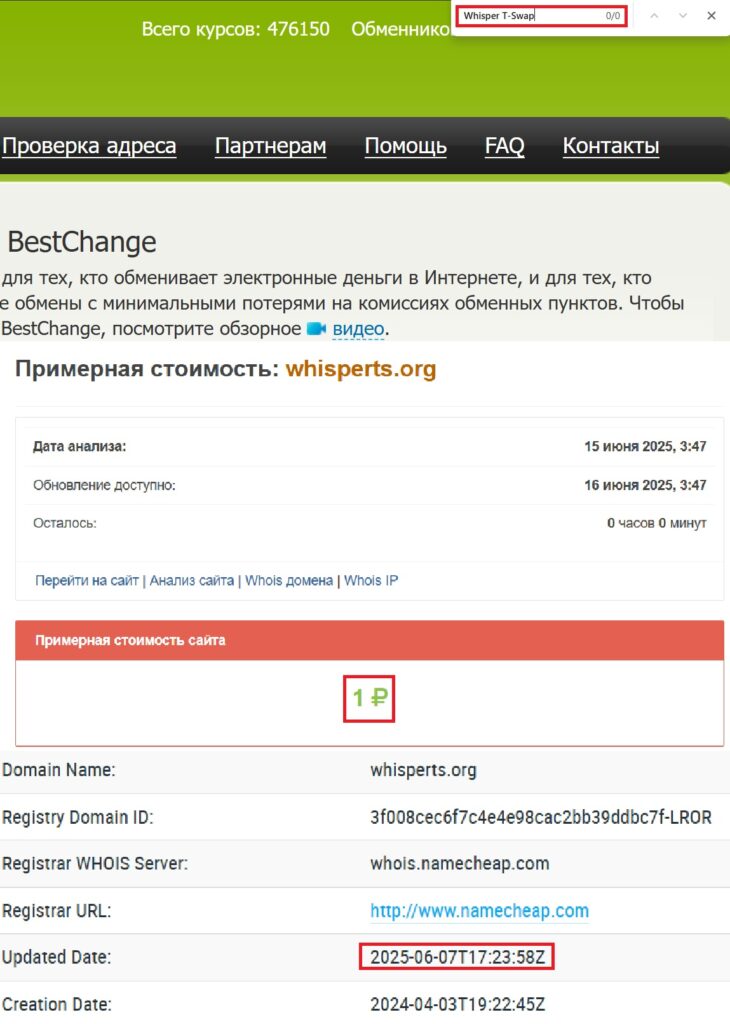 Взгляните на сайт Whisper T-Swap. Здесь шаблонный дизайн, отсутствие индивидуальности. Возраст площадки совершенно не соответствует времени функционирования обменника. При анализе домена было обнаружено, что его зарегистрировали в 2024, но только в 2025 на нем началась активная работа. Из этого делаем вывод, что мошенники попросту купили ранее созданный ресурс, немного его переделали и тут же взялись за проворачивание своих недобросовестных махинаций.