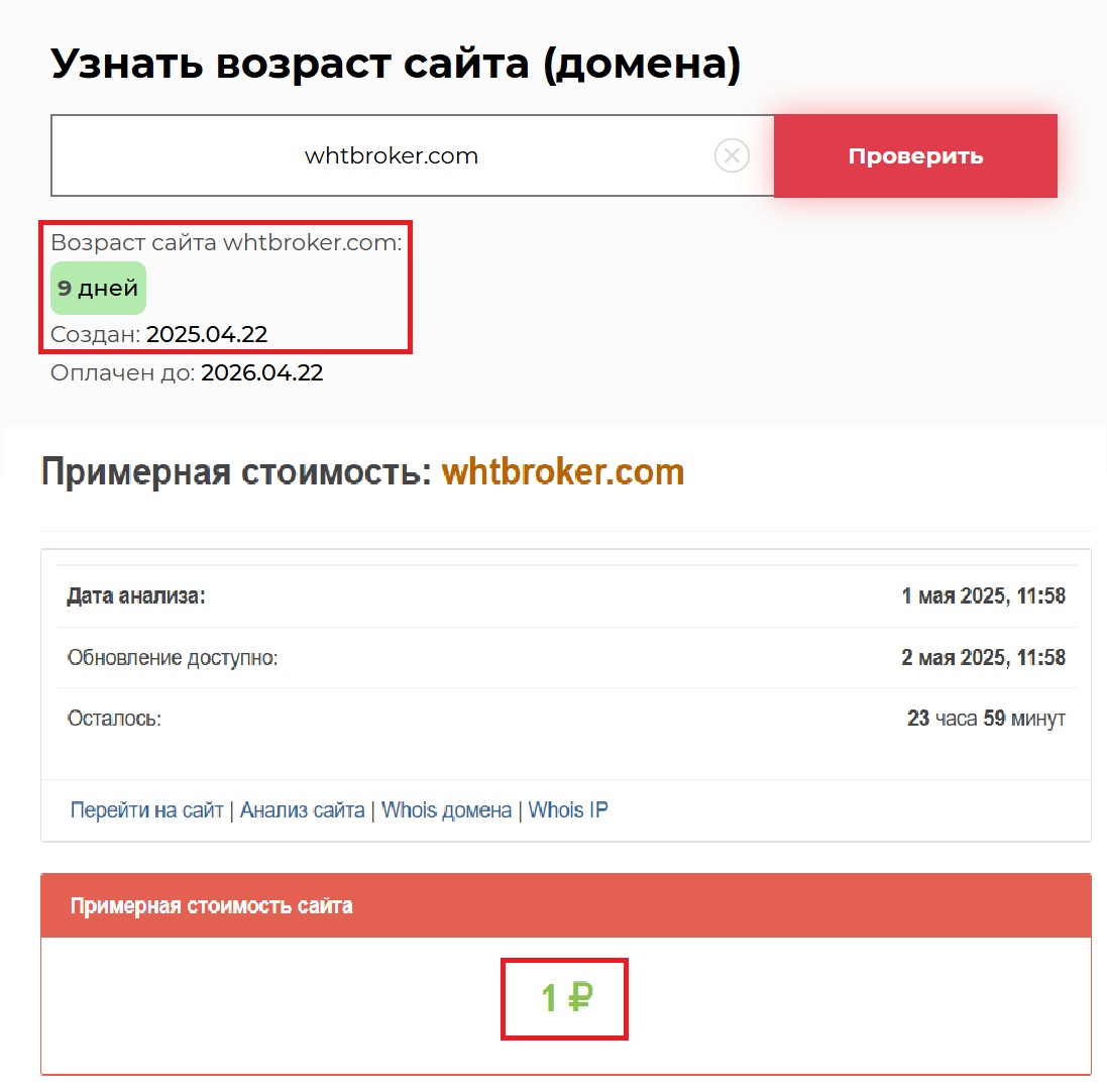 Теперь — факты. Проверка показала, что сайт существует всего 9 дней. А теперь честно — можно ли за такой срок наработать репутацию, наладить финансовые процессы, получить разрешения от регуляторов и выстроить доверие? Ответ очевиден. Тем более, если посмотреть на цену ресурса — один рубль. Да-да, вы не ослышались. Проект, который обещает вам прибыль, стоит меньше, чем буханка хлеба.