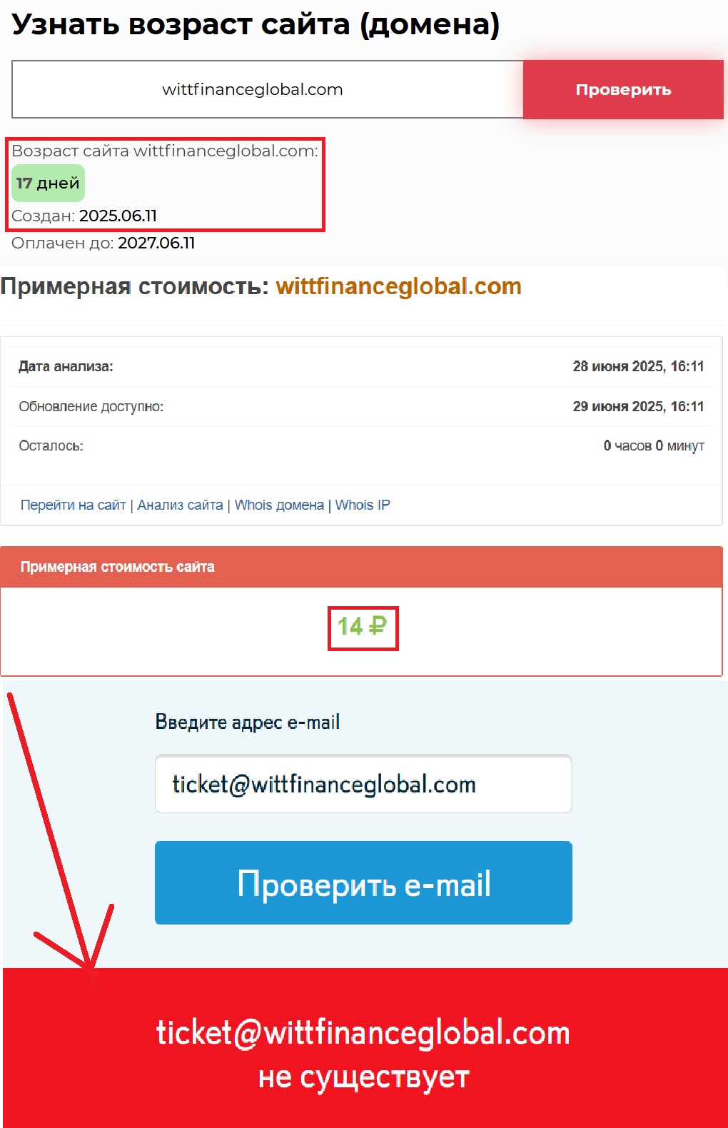 Мы решили докопаться до сути и проверить, как давно вообще существует WITT Finance. Использовали сервисы Whois и Seolik, и вот вам сухой факт: сайт запустили всего 17 дней назад, а именно 11 июня 2025 года. Скажите честно, вы бы доверили серьезные инвестиции компании, которая не просуществовала и месяца? Вряд ли. К тому же цена этой «конторы» равна всего 14 рублям. Признайтесь, звучит это как шутка, а не как серьезный бизнес. Да такие суммы вызывают лишь смех и огромное количество вопросов. Если проект оценивают в такие крохи, о каком качестве услуг вообще может идти речь?