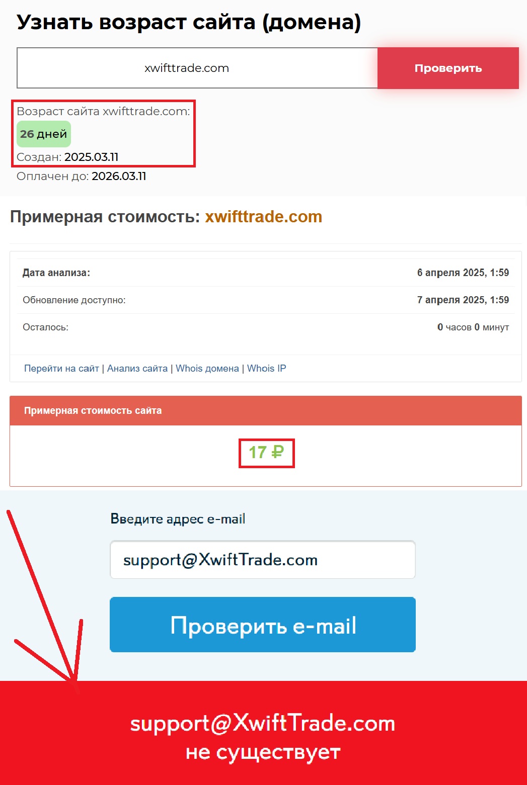 Теперь давай подумаем. Если бы Xwifttrade действительно имел отношение к международному рынку, неужели у него не было бы лицензии, прозрачных документов, внятной регистрации? Ну конечно была бы. А тут — пустота. Ни одного официального подтверждения. Ноль. Даже контактная форма — и та не работает. Единственная почта support@XwiftTrade.com и та нерабочая.