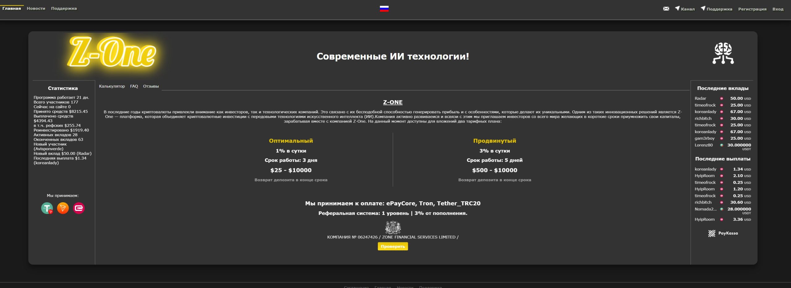 Давайте говорить прямо. С каждым днем в сети появляется все больше так называемых инвестиционных платформ, каждая из которых пытается убедить вас в своей исключительности. Заманчивые обещания, красивые фразы, графики, цифры, глянцевый сайт — все это только фасад. В действительности же — те же схемы, те же цели. Максимально быстро выкачать деньги из карманов доверчивых пользователей. Вот и Z-One не стал исключением.