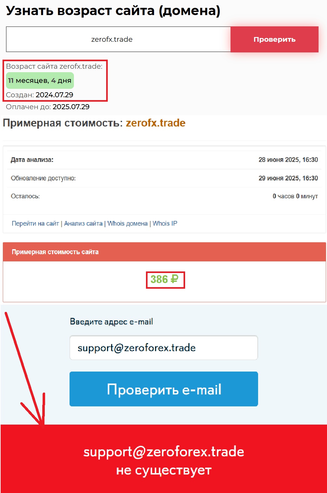 Вы можете спросить: а что с регистрацией, что с лицензией? Хороший вопрос. Официальных документов, подтверждающих легальную деятельность, не предоставлено. Ни одного. Вообще. Да и в качестве контактной информации на сайте указана лишь фейковая почта support@zeroforex.trade. То есть связаться с реальными представителями проекта не получится. Попробуете — будете только терять время.