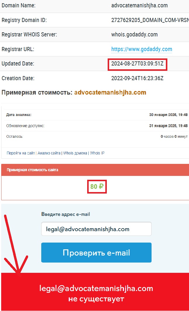 Вместо помощи клиентам, аферисты нагло крадут деньги у неопытных вкладчиков, обещая им несбыточные перспективы. Данный лохотрон использует примитивный сайт .advocatemanishjha.com с минимальным функционалом. Проверка возраста при помощи сервиса Whois показала, что возраст проекта составляет всего несколько месяцев. Да, сам домен появился в сети еще в сентябре 2022 года, но если смотреть на дату обновления, то становится ясно — афера появилась 27 августа 2024.