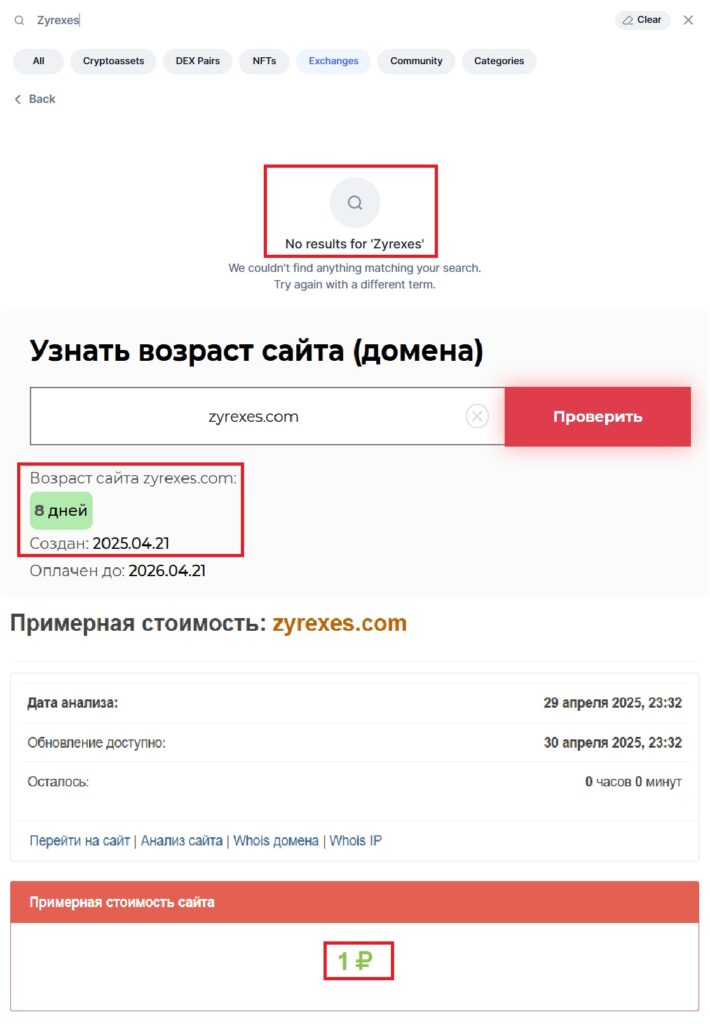 Проверив мониторинги, найти Zyrexes в их списках нам не удалось. Этот момент говорит о том, что специалисты не могут доверять данному проекту и, соответственно, связываться с ним из-за этого не стоит.
